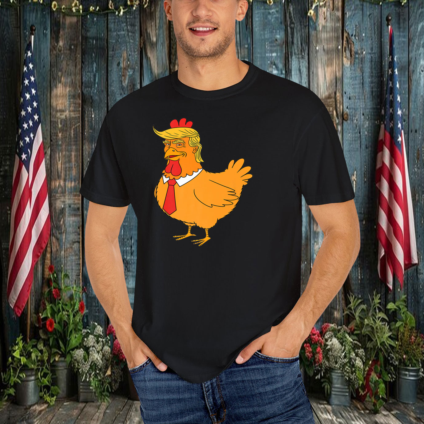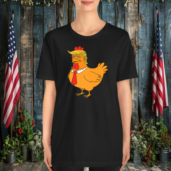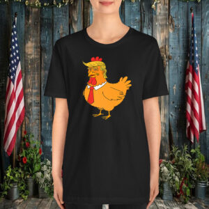 The design features a bold and eye-catching graphic of a cartoon chicken wearing a familiar hairstyle, making a playful jab at a well-known public figure. This shirt is sure to spark conversations and turn heads wherever you go.